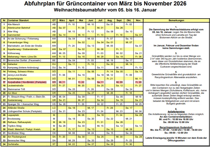 siehe https://www.cuxhaven.de/unser-service-fuer-sie/abfallwirtschaft-and-strassenreinigung/gruenabfall-1-1.html – in der Mitte auf dieser Seite kann der „Abfuhrplan für Grüncontainer 2026“ als pdf heruntergeladen werden.